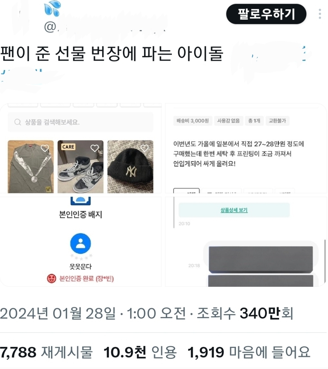 팬이 준 선물 번개장터에 팔았다가 걸린 아이돌 (+해명글)