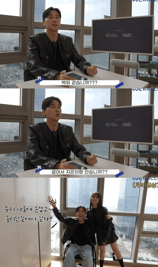 그러면서 "제 바람이 있다면 정부에서도 관심을 갖고 지원을 많이 해주셔서 전세계에서 가장 먼저 이 기술력을 선점해서 전세계에 보급할수있는 첫번째 나라가 됐으면 하는 바람이 있다. 여러분도 많이 관심가져주시고 앞으로 저처럼 마비되신 분들이 두발로 일어서서 생활하수있는 날이 온다면 정말 좋지 않을까요. 저희 위라클도 응원하겠다. 힘내주시고 나중에 저희도 초대해달라. 가고싶다. 저도 언젠가 이 로봇을 착용하고 두발로 지은이의 손을 잡고 용리단길을 걸어가는 그날을 기대하며"라고 인사했다.
